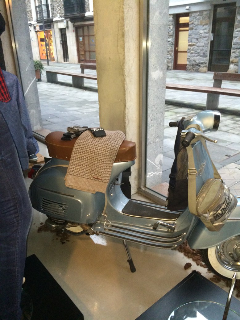 Cosa ve ne pare di questa? Ero in giro per San Sebastian quando dentro una vetrina ho visto questa bellissima vespa, azzurrino metallizzato con finiture cromate e sella cuoio! Fantastica!!!